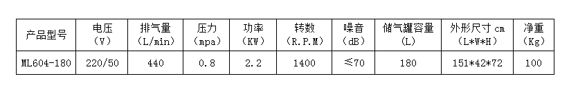 臺冠空氣壓縮機,簡稱空壓機,是工業現代化的產物,ML604-180壓縮泵用途非常廣泛,主要表現在用于輪胎充氣、噴漆、潛艇沉浮、沉船打撈、海底石油勘探、氣墊船、食品、制藥工業,利用壓縮空氣攪拌漿液、高壓空氣爆破采煤等等。