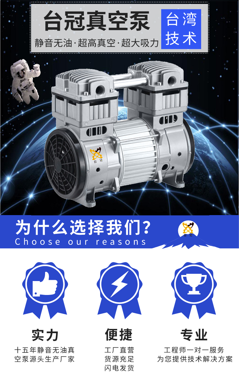 • 產品特性:1:超高真空 2:超低靜音 3:體積輕巧 4:外觀優美 5:結構簡單 6:維護容易 7:完全無油 8:更易保養